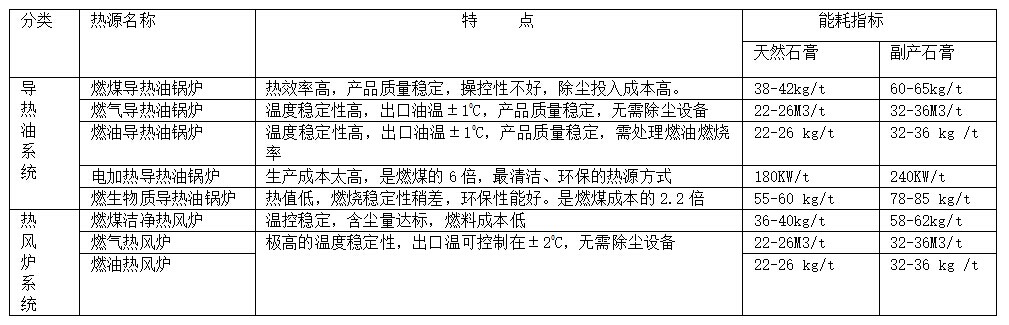 熱源主要用于天然石膏粉、工業(yè)副產(chǎn)石膏粉、干混砂漿的生產(chǎn),主要考核指標(biāo)是系統(tǒng)熱效率、除塵效率、熱源的余熱二次利用等指標(biāo),熱源燃料消耗是生產(chǎn)成本的主要指標(biāo),占生產(chǎn)成本的20-40%。選擇合理的熱源系統(tǒng),在節(jié)約燃料的同時(shí),原料的烘干質(zhì)量、后工序產(chǎn)品煅燒質(zhì)量的主要質(zhì)量控制點(diǎn)。經(jīng)過反復(fù)論證和技術(shù)攻關(guān),熱源系統(tǒng)從原利用燃煤導(dǎo)熱油系統(tǒng)鍋爐、煤流化床到各種熱源導(dǎo)熱油鍋爐、多燃料熱風(fēng);特別在熱源出口溫度的穩(wěn)定性上按生產(chǎn)線不同工藝進(jìn)行了調(diào)整。